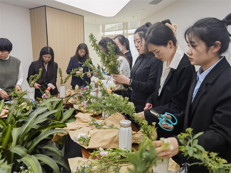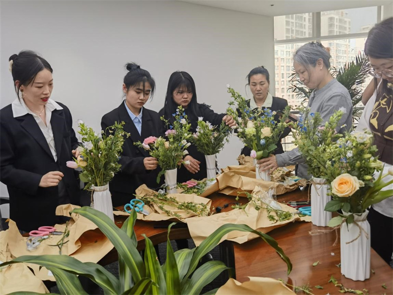 人面桃花相映紅?,F(xiàn)場(chǎng)女員工們化身“巧手設(shè)計(jì)師”,各自發(fā)揮創(chuàng)作靈感,將手中的花材進(jìn)行枝葉修剪、色彩搭配和造型設(shè)計(jì),用靈動(dòng)的雙手詮釋著屬于自己的花語。在花藝師的帶領(lǐng)下,在學(xué)習(xí)與實(shí)踐中,享受著創(chuàng)作的樂趣。一瓶瓶錯(cuò)落有致、創(chuàng)意十足的插花作品展現(xiàn)眼前,令人賞心悅目。